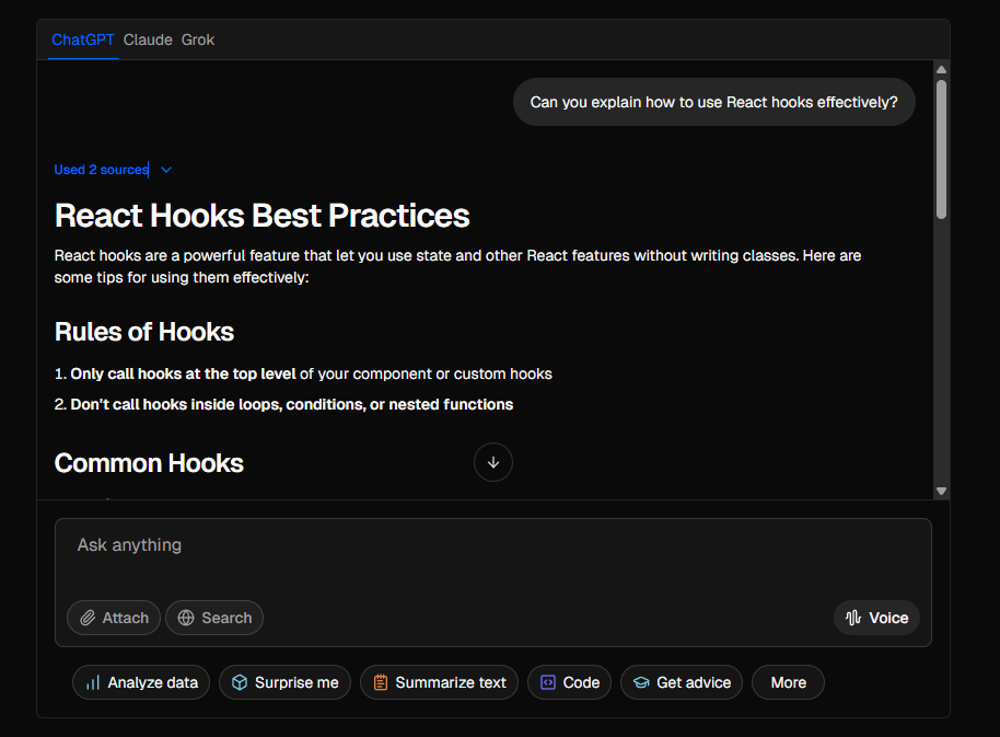 Vercel 发布的 AI Elements 基于 shadcn/ui 设计系统,提供对话、消息、文件上传、语音输入等开箱即用的 React 组件,内置流式渲染、可访问性与深色模式,支持任意 LLM SDK 接入,通过复制源码即可按需定制,帮助开发者十分钟内拼装出专业级 AI 交互界面,省去重复 UI 与状态管理代码。