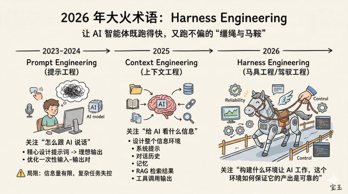- Harness Engineering(2026):关注“构建什么环境让 AI 工作,这个环境如何保证它的产出是可靠的”